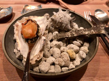 黒い皿の上に石をもり、磯をイメージした一皿。