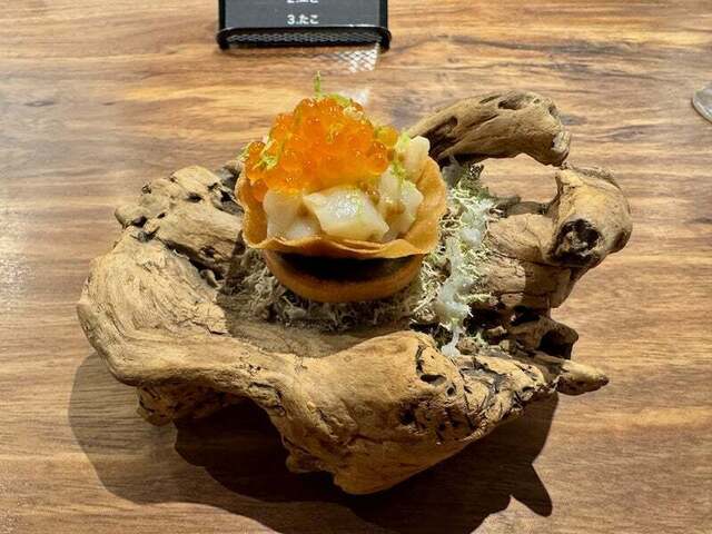 帆立貝柱に粒マスタード。上には硬めでプチプチ食感の強いマスの卵。ライムの皮を削りかけています。サクサクのタルトにたっぷりのホタテ、プチプチなマスの卵と粒マスタードの食感も美味しい。