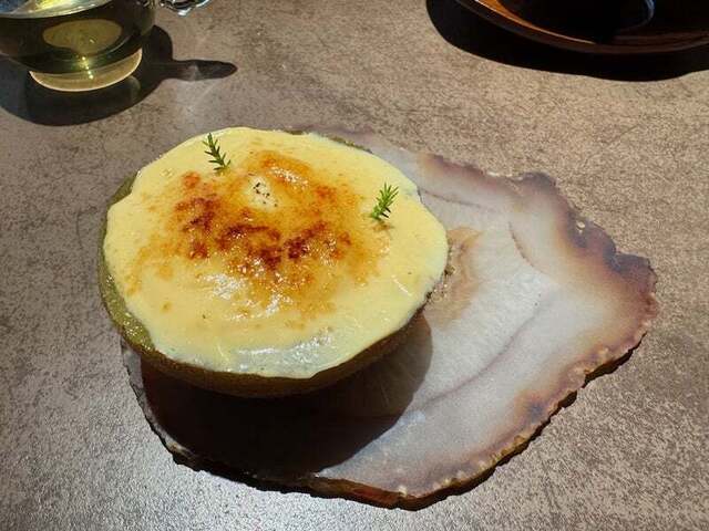 ゴールデンキウィの器に。浅くくりぬき果肉を残しつつ、くり抜いたところに果肉とキウィのシャーベットを詰め込んでいます。シャンティと山梨のジンを使ったカタラーナクリームを乗せてキャラメリゼしています。