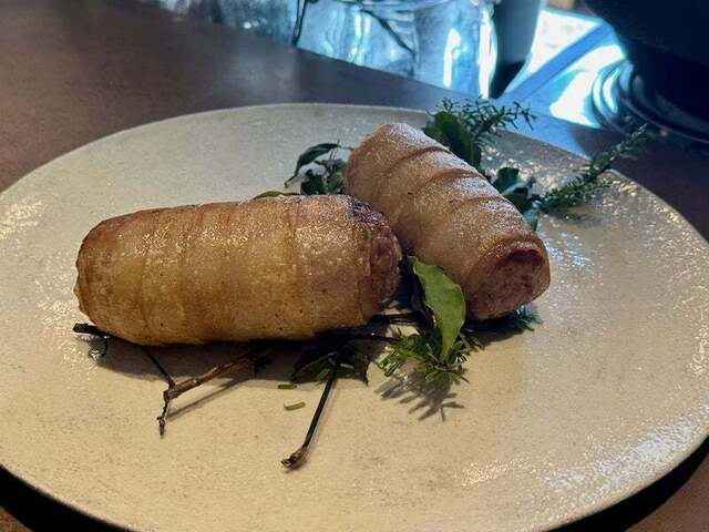 伯爵という品種のジャガイモをロール状にフリットにして中に5種類の馬肉を詰めています。ロースは生肉、ハツとバラ肉は軽く加熱し、モツは薄く味噌煮込みにし、この4種類を卵黄とネギのオイルで和えて詰めているいるのだそう。上にさらにローストしたネギ。最後の馬肉であるタテガミは塩と香辛料でラルドにし、薄くスライスして乗せています。そして上にナスタチウムの葉。