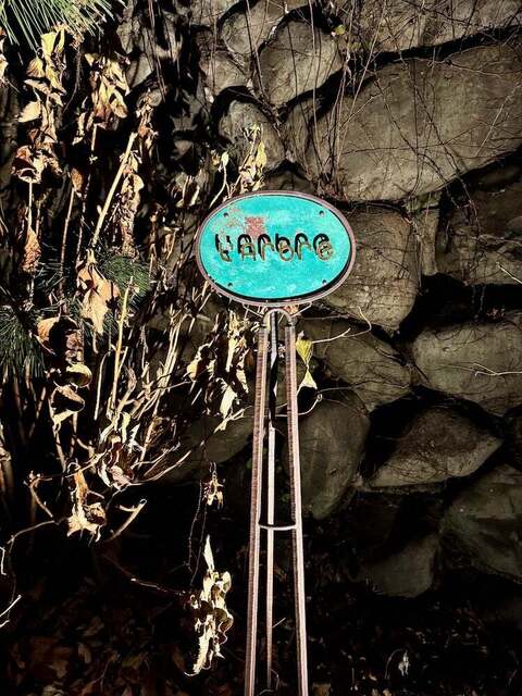門の右に楕円形の青い看板を見つけました。