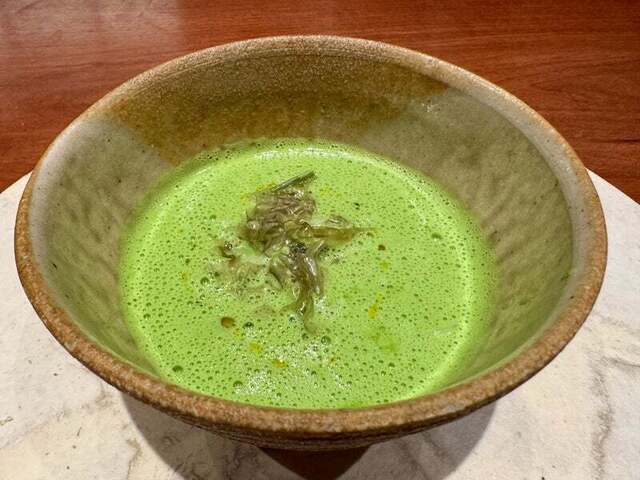 野菜のスープとピュレに東京軍鶏とカツオのダブルの出汁のスープ。胡麻でクリーミーに泡立てて口当たりをよくしています。。