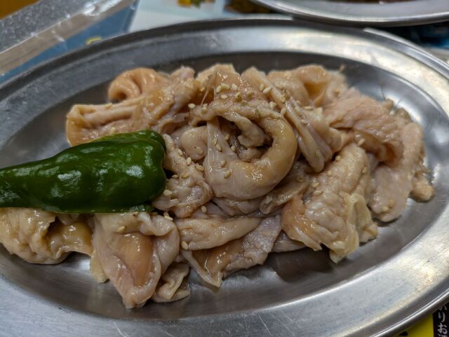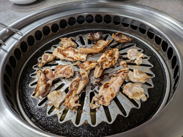 頼んだのは若チキン(ムネ肉)、ネック(首の周り、「せせり」)、鶏皮(小サイズ)、鶏ハラミ、鳥モツ盛り(ハツ、レバー、砂肝)に焼き野菜、ナムル、キムチ。もみダレに漬け込んだ肉を焼いて、つけダレで食べるといくらでもいけるという感じです。頼みすぎかと思ったのですが、2人で楽々完食でした。