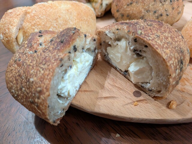 珍しいのはクリームチーズと黒コショウのパンです。切ってみて、クリームチーズがぎっしり詰まっているのは驚きました。黒ゴマに混じって、ところどころに黒コショウが粒のまま。香ばしいパン、チーズと一緒に黒コショウをかみつぶすと、もうそのまま食べるのが惜しく、ワインかビールが欲しくなります。
