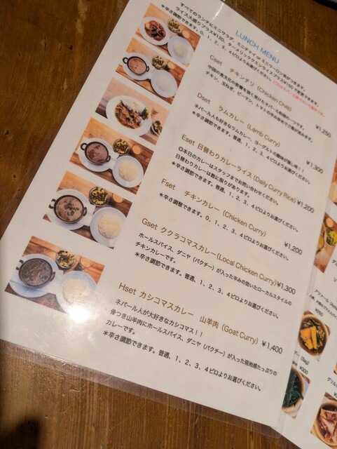 メニューの裏に、ダルバートの丁寧な説明があります。基本は、ごはん「ダル」と豆のスープ「バート」。これに野菜をスパイスで煮込んだ「タルカリ」、肉のカレー「マス」、漬物や酸味のペースト(調味料)の「アツァール」をワンプレートに盛り込んだ、まさに定食です。