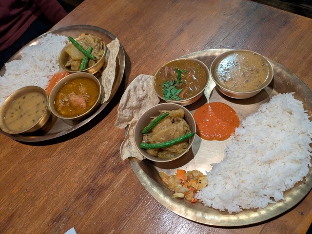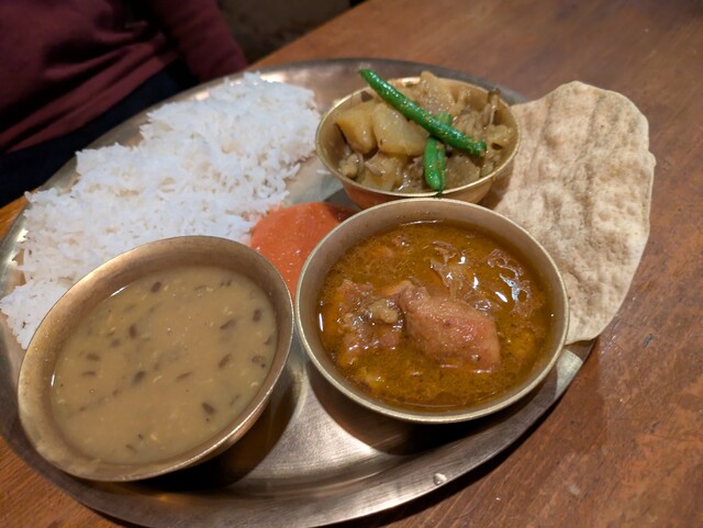 以前、ネパリコの駒沢店を訪ね、初めてネパールの定食「ダルバート」を食べました。このときのカレーはチキン。メニューにあった「カシ」が気になっていました。ヤギ肉です。渋谷店を家族と2人で平日ランチで訪問。思い切ってカシのダルバートを注文してみました。