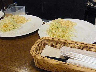 出てきたパスタ、大盛ですが量は少な目。男子にはちょっと物足りないかも。ソースはなかなかいいオリーブオイルを使ってるようです。塩味も控えめで絶妙。しかし白眉はやはりもちもちのパスタ。乾麺じゃ絶対出ないこの食感。太さはスパゲッチー二かな?ディチェコで言うとNo11くらいでソースのからみも申し分なし。これで大盛800円ですから行列になるわけですな。美味いです。次はトマトソース行ってみよー。[2012.1]