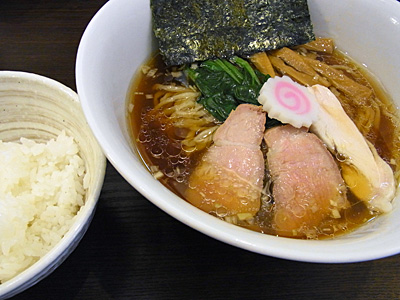 で、不思議な店名のこちらのお店。店内ほとんどカフェなインテリア。普通のラーメン屋のお冷やのグラスは例の東洋佐々木ガラスのHSですが、ちょっと気の利いた店だとデュラレックス使ってますよね。でもここのは違うデザインでした。結構凝ってます。普通のラーメンは750円、ランチタイムは半ライスがサービスとなります。出てきたラーメン、まずスープはコクのしっかりとした醤油。煮干しも入ってる気がしますが、絶妙な案配で、これはうまい。で、縮れ系の麺がさらに秀逸。上品なスープがよくからむ麺、バランスいいです。半ライスのごはんもちゃんとしていてぴかぴかの炊きあがり。ああ、これは高得点ですよお父さん。チャーシューは豚と鶏が両方入っていて、これは珍しい。特に鶏が入ってるのは珍しいですね。いわゆる中華料理屋の「鳥そば」のそれ。