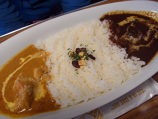 カレーはやはりGHEEゆずりのメニューのようで、僕はバターチキンと野菜カレーのコンビ、カミさんはバターチキンと牛スジカレーのコンビ。牛すじカレーはここのオリジナルらしくGHEEには無かったメニューらしい。