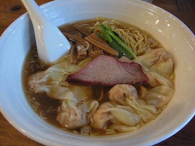 出て来た丼、まずスープを。お、上品な鶏ガラスープに煮干しの香り。いいですね、でも、もうちょっと煮干しを絞るとさらに良くなりそう。このスープ、卓上のGABANの胡椒にもよく合います。雲呑は生姜が利いてて美味いです。麺は細めのストレート麺ですがもちもちしていてのど越しがよろしい。雲呑が5個というのでボリューム多めかな?と思いましたが全然へーきでした。美味いです。また行きます、ごちそうさまでした。ただし欲を言えばカウンターの高さが問題。椅子に対してカウンターが高すぎるからお客さんは皆「犬食い」になってる。食べづらいです。[2014.9]