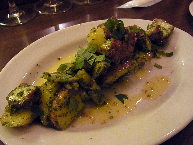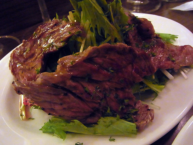 とりあえずビール(ハートランド)で乾杯して前菜はタコとジャガイモのジェノヴェーゼソース。うむうむ、なかなかいいですな。食欲にスイッチが入ります。で、500円にしては意外とポーションが大きいですね。若い人にも人気なのがよくわかる。次いでハラミ焼き。これがまた美味い。ワインにスイッチ。グラスワインも全品500円均一で、しかも量もたっぷりで良心的。で、次はレバーパテとバゲット。これで赤ワイン。で、美味かったのが牛すじ煮込みのオムレツ。なんだかんだで二人で10杯くらい飲んでしまいました。そういや、メニューはレバーにハラミに牛すじってホルモンじゃない。だから美味くて安いメニューが提供できる訳ですな。店内雰囲気もいいんですが、唯一の問題点がBGMが五月蝿いこと。これだけ充実した店なんだから、むしろ音楽なんて無くていいと思うんだけど。。。[2014.9]