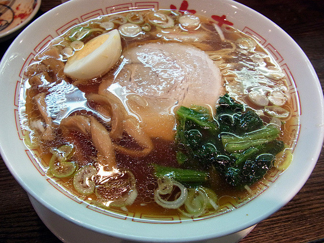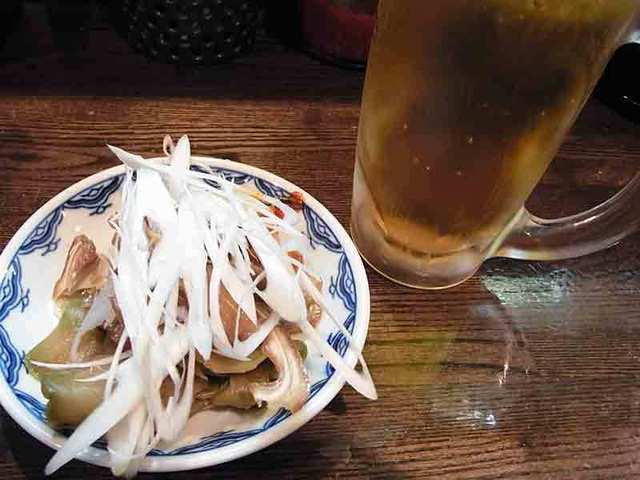 カウンターだけの店内、お目当ての「ちょっと一杯セット」980円は券売機では買えないのでカウンターで直接注文します。まずはどどーんと生ビール。もちろんちゃんとした生ビールです。仕事の後なのでやはり格別、ほどなくおつまみがやってきます。ミミガーの紹興酒付け、ザーサイ、キムチの3点盛りに刻んだネギ。こりゃうれしい。つまみながらテレビの「警察24時」なんかを見ていると、立派なオヤジになった気分です。やがて餃子が焼き上がる。これはちょっとセントラルキッチンぽい感じで、イマイチですが980円のセットですからね。ビールが終わる頃にカウンターへ声をかけるとラーメンを茹で始めてくれます。で、出てきた東京醤油ラーメンが美味かった。麺はかんすいの香りたっぷりの懐かしい味。スープが絶品でした。世の中の「にぼし入れ過ぎエセ東京ラーメン」はここのスープを見習って欲しい。にぼしは入れすぎるとエグ味と苦みが出てしまうんですよー。チャーシューではなく、煮豚、玉子は、味付けではありませんが素朴にうまい。満足度120%のちょっと一杯セットでありました。また来ます、次は雲呑麺行きたい。それにしてもこんな店、知らなかったぁ。[2014.10]