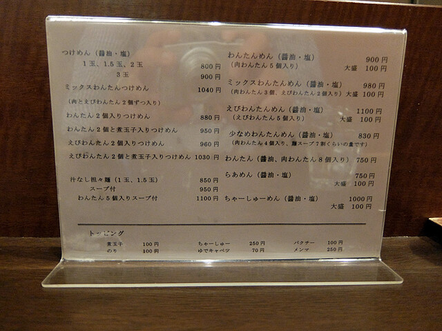 商店街をひょいと曲がった路地にある店。雰囲気抜群です。建て付けの悪いガラス戸を空けるとファンタジーな空間でした。長いカウンターだけの店内、店主とバイトの女の子。夕方7時すぎの柔らかい光の下、BGMなし、ほんのわずかにラジオの音が聞こえる。これで柱時計が鳴ったらもう、映画「深夜食堂」の世界です。ラーメンなんてどこで食ったって同じだろという人はおいといて、これは絶対計算ずくの空間だと思います。厨房のシンクもぴかぴかで期待に胸がふくらむ。で、ここには券売機が無い。これも計算だと思う。