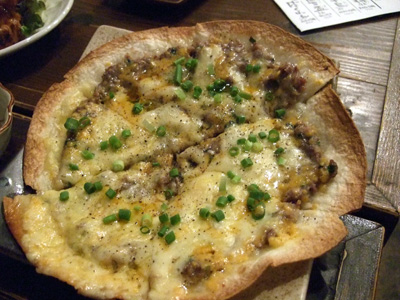 厚木B級グルメで有名なシロコロホルモンも初めて食べました。最後に食べたピザはなんと餃子味。生地の上に餃子の具を乗せて焼いた物。ラー油入りの醤油ダレまで出て来ちゃいましたよ。焼酎はすべてキンミヤ、しかも量もたっぷりでうれしい。酒飲みのことを分かり切ってるぞ、この店は。近所にあったらヤバい、毎日来ちゃうぞ。