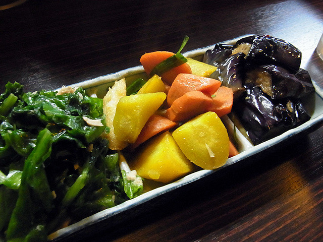 三点盛り。島にんじん、茄子のぴり辛、ポテトサラダ