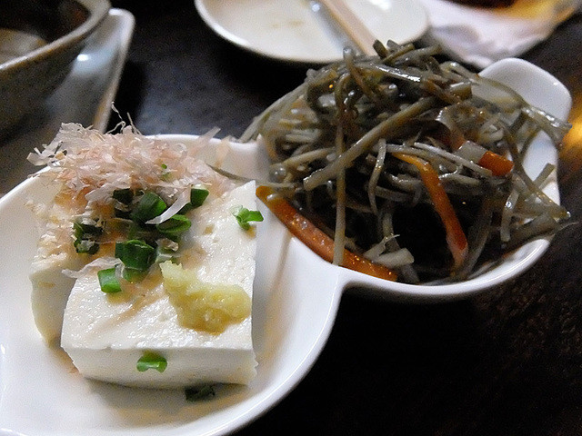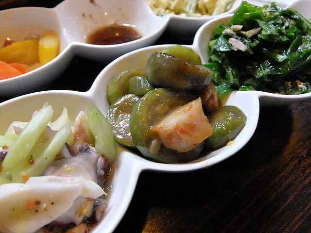 三点盛り。タコとセロリのマリネ、ナーベラー(ヘチマ)炒め、ちきなー(芥子菜)とシーチキンの炒めもの