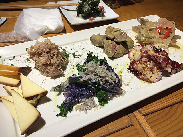ビールで乾杯して前菜4種盛りはポークリエット、タコとセロリのマスタードソース、新たまねぎとレンズ豆のビネガー、そしてズッキーニ。特にタコとポークリエットが美味かったなぁ。塩味がとても優しい。