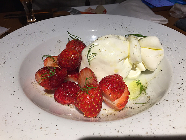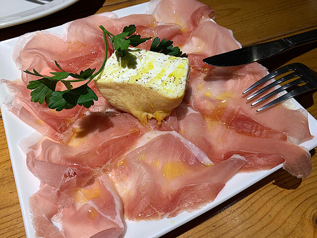 燻製ブッラティーナ、つまりチーズを生ハムに乗っけて食べる。生ハムは常温にして指で触ると脂が溶けるのでそのタイミングで食うとめっちゃ美味い。