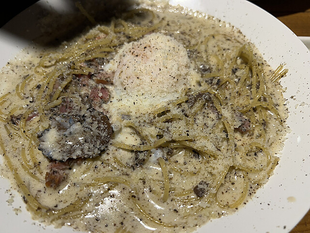 その後、旬のタコを頼んで最後は黒トリュフのカルボナーラがどうしても食べたくて頼んだら、もちろんめっちゃ美味しいんだけど、僕らの許容量を超えてましたww次回からは注文量考えないとな。