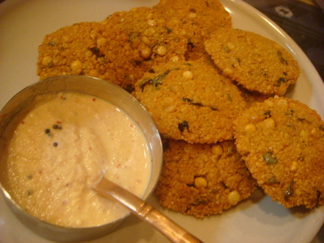 ヨーグルトに漬かったワダ(豆ドーナッツというべきか?)。