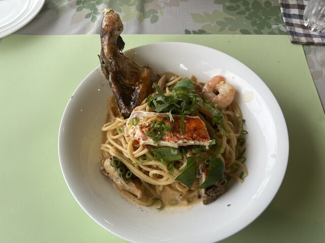 この日のパスタにはシマアジのカマとカキの燻製のトッピングでいつもより具だくさんで旨味もアップ⤴