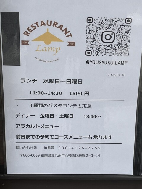 この日は、食べログレビュアーさんの口コミを見て、八幡西区荻原に今年の8月New Openしたイタリアン『Lanp』に行きました。