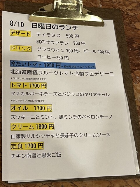 ランチメニューは日替わりの定食と日替わりのパスタで、値段はどれも税込みで1500円。