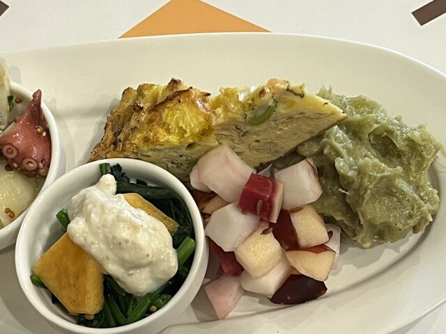 副菜はスパニッシュオムレツ、鶏の白レバーパテ、レッドオニオンとマグロのマリネ、小松菜とパプリカのソテー。