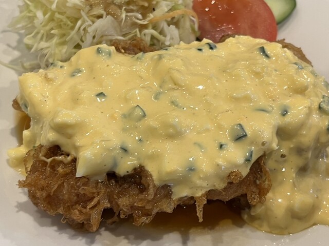 こちらのチキン南蛮は、本場と違って鶏もも肉を1枚丸ごと揚げてあり、もう一つの主役の絶品タルタルソースがたっぷりと添えられています。