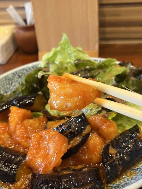 エビチリは結構多めのプリプリ小海老と揚げ茄子で、海老は背ワタを取り除く嬉しいひと手間。