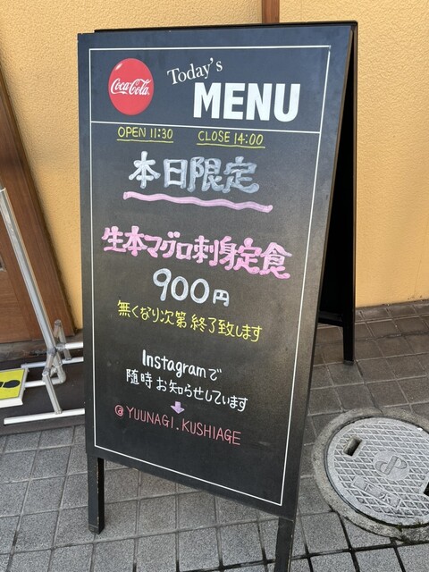 牛すじ煮込み狙いでしたが店前のメニューボードには「本日限定!生本マグロ刺身定食」の嬉しいお知らせ♪
