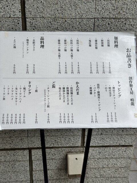 自宅の近くにあるにもかかわらず、1年以上住んでからようやく訪れることができました。午前8時から整理券が配られ、30分ごとに一組ずつです。ラーメンは4種類の味から選べます:担担麺、麻辣、醤油、塩味。それぞれ、スープラーメンかつけ麺かも選べます。今回は塩味ラーメンと看板の担担麺、さらにチャーシューライスとよだれ鶏を追加しました。