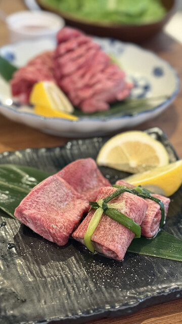 「極上タン盛り合わせ(1,580円)」も忘れずに。厚切り・ネギ巻き・薄切りのバランスが絶妙で、それぞれ違う表情のタンが楽しめる。個人的にネギ巻きがドンピシャ。タンの脂とネギのシャキ感、最高コンビ。