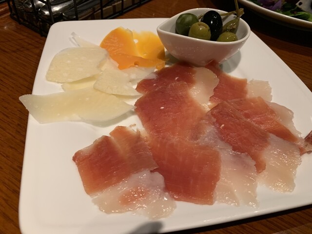 生ハムチーズの盛り合わせ、オリーブもつけてもらい