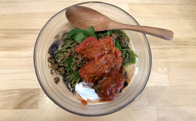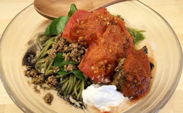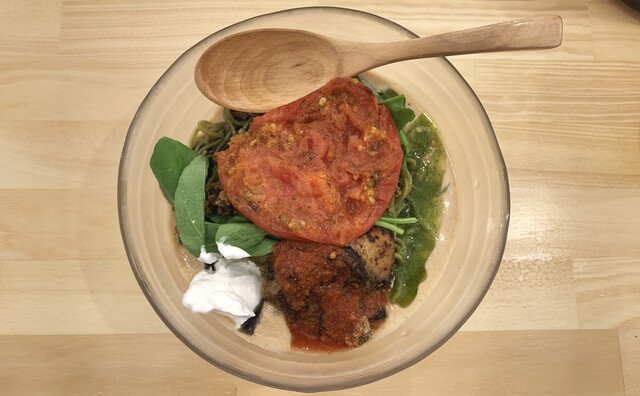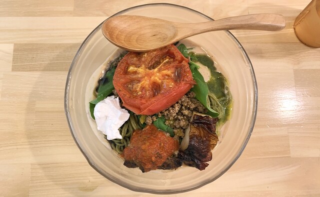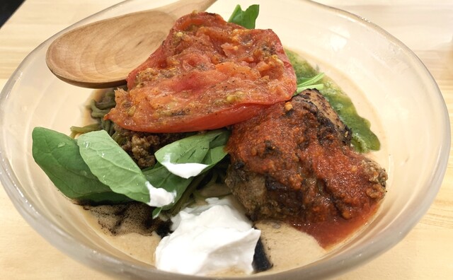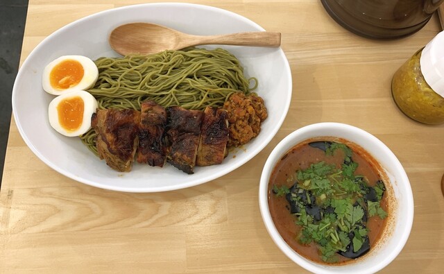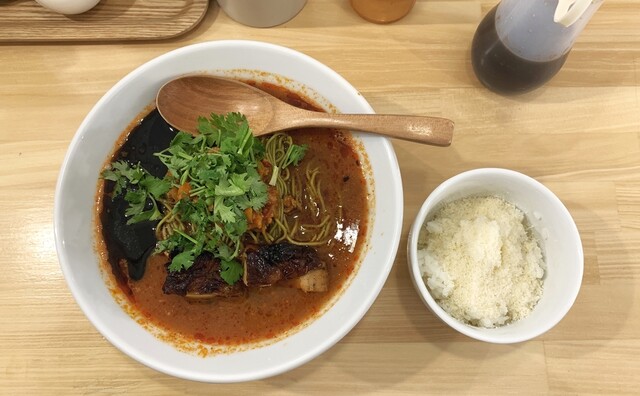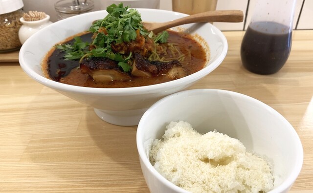 つけめんは、モリンガ麺の美味しさをダイレクトに感じられ、付け合わせのミートソースと和えてスパゲティのように食べるのもアリ!残ったスープは、スープ割にもできますが、おすすめはパルミジャーノチーズのライスで!フワフワで芳醇なチーズがたっぷりで、サイズは豆・小・大と腹具合に応じて追加できるところも嬉しい。