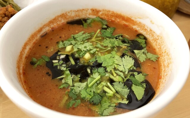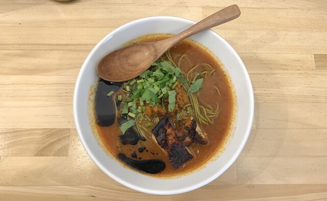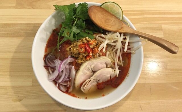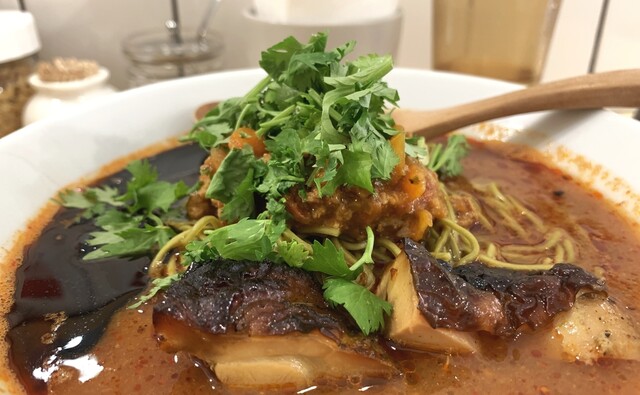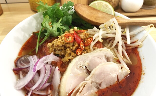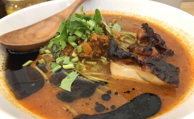 チリ系の辛みとトマトの酸味とミートソースの旨味にマー油のコク、パクチーの爽快な風味(パク無し可)、鶏チャーシューもしっとり美味。