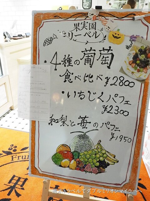 店頭にはお勧めメニューの案内看板も出ています。この時期はぶどう、いちじく、梨が旬、いずれも食べてみたいと思うラインナップです。定番のパフェメニューはこちら。フルーツパフェといっても、その時期の旬のフルーツを使っているので、メニュー写真通りのパフェが提供されることはありません。そこが、「果実園」でパフェをいただく魅力です。