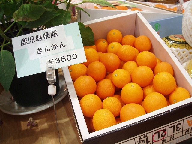 品物が運ばれてくるまでの間、周囲を見渡すと、座った大テーブルの中央に飾られていた立派なフルーツに見入ってしまいました。見るからに形良く、色濃く甘そうなみかん「甘っ子」やひと箱3600円もするキンカンなどなど・・・キンカンは自分の家にある木からとって食べるものと思っていたので、丁寧に箱詰めされたキンカンにびっくり。きっとこのキンカンはとっても甘いのだと思います。