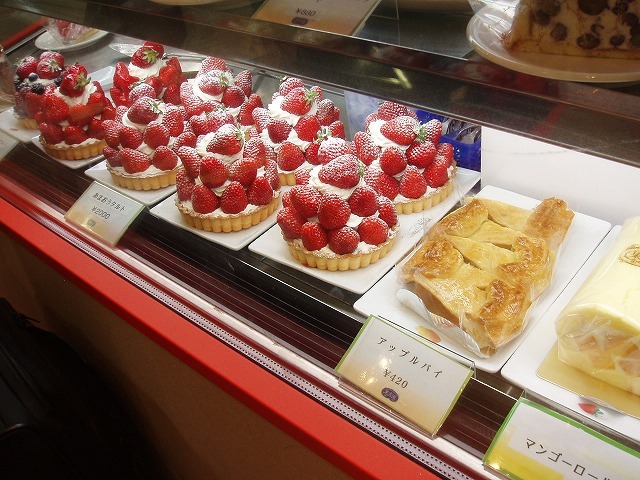 待っている間、お店の前にあるガラスケースに目をやるとあまおうのタルト(2000円)など、フルーツを使ったケーキが販売されていました。タルトは、1人で食べるにはちょっと大きめサイズ、でもふたりで分けると小さいか?大粒のいちごが山のように積み重なっているタルトです。タルト好きの妻は、このタルトに目が釘付けになってしまいました。そのほかにも、