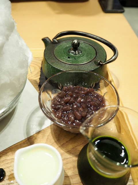 最初に妻のかき氷がトレーに乗って供されました。白い綿菓子のような氷です。このまま食べても美味しそうと思うほどのふわふわ感。このようなかき氷を見たのは初めてです。抹茶蜜と小豆、練乳は別添え。ふわふわの氷が溶けないようにとの配慮です。この形式は甘みを自分で調節できるので、妻はうれしい。小豆は柔らかく煮詰められたもの、口に含むとほろっと崩れます。奥に見える鉄瓶にはお茶が入っています。