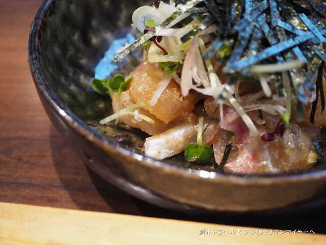 この日の刺身は鯛の胡麻和え。かいわれ、ねぎ、海苔が乗っています。新鮮な鯛の刺身にすりごまの醤油がまぶされたもの。新鮮なお刺身と美味しいご飯は最高の組み合わせ、どちらもおいしくて、うれしくなります。