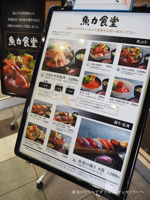 このお店にしようと決め手になったのは、店頭に出ていたこの看板。「魚力食堂」は魚屋さんが経営する食堂、「魚のプロが目利きした市場直送・旬の魚介類を中心に自慢のお食事をご用意しました」のコピーとお料理の写真に惹かれました。この写真を見たら、食べたくなりませんか?丼、握り、刺身定食と、好みの食べ方が選べます。また、お魚の種類によってお値段が違うのもわかりやすくて良心的。