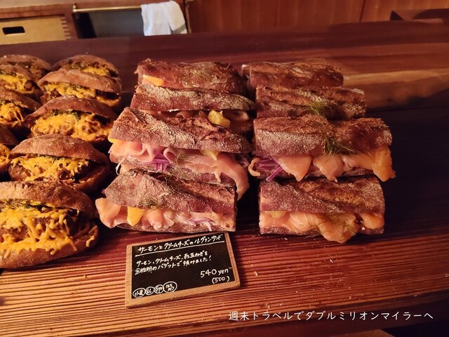 以下、この日並んでいたパンの一部を写真で紹介します。店内は照明が暗めであまりきれいに撮影できませんでした。お目当ての「めんたいフランス」は陳列されておらず、レジで本数を指定して購入する方式。棚のパンを選ぶわけではないので、先にレジに行きたかったのですが、人で埋まっていてそれもできず、列が進んでいくのを待ってレジに到達。本数を指定して購入しました。