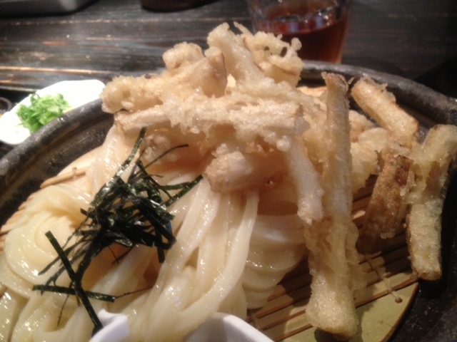 もちのろんワタクシが選んだのは一番人気の「土ゴボウ天ざるうどん」。ツヤツヤのコシがありながらも喉越しつるんなもっちり麺と揚げたての香り高い牛蒡天がたまらない〜。