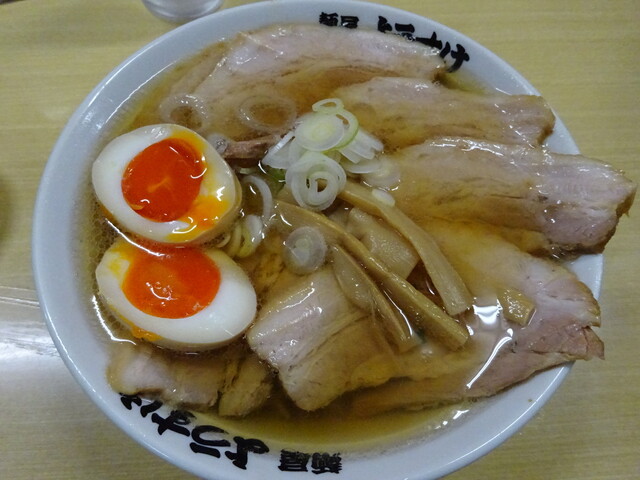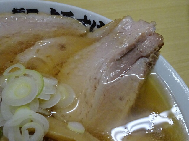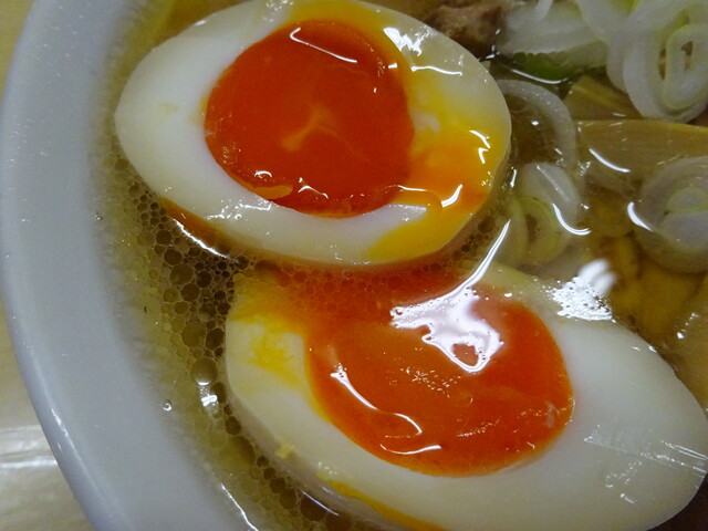 澄んだ綺麗なスープに、軽く縮んだ平打ち麺・厚めのチャーシュー・黄身の色が濃い煮タマゴが入り、