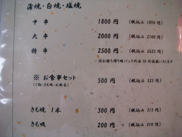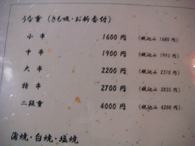 うな重は、小串1,600円 ・中串1,900円 ・大串2,200円 ・特串2,700円・ ニ段重 4,000円 の5種類。