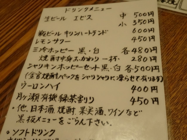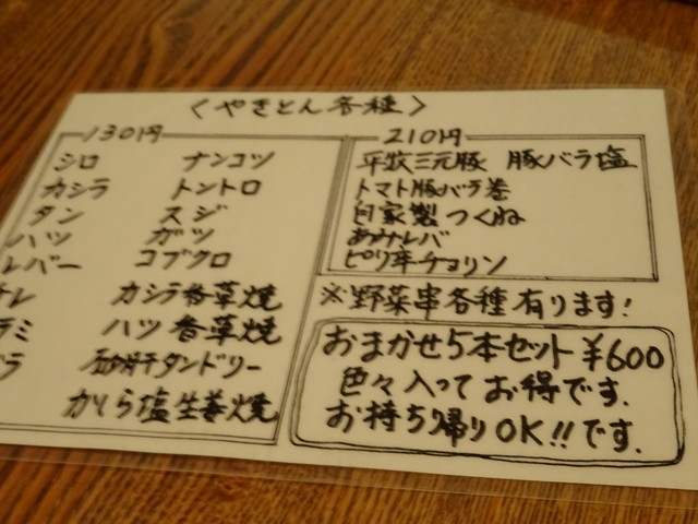 やきとんメニューは、シロ、かしら、タン、ハツ、レバーなど定番は勿論、他に、かしら塩生姜焼き、カシラ香草焼き、砂肝タンドリー等ひと手間加えたメニューなどもあり嬉しいですね。基本1本130円とリーズナブル!