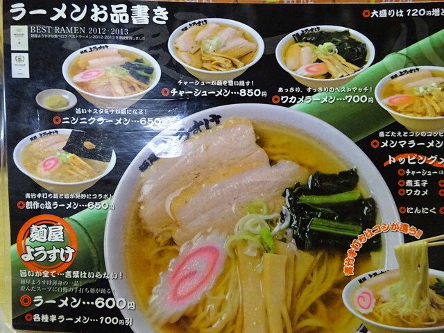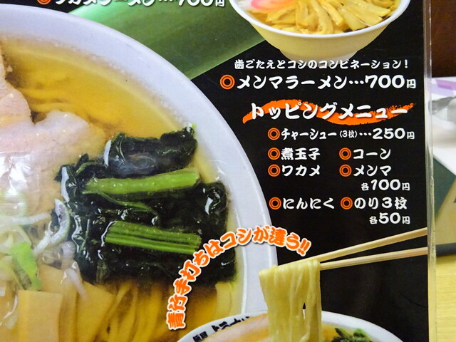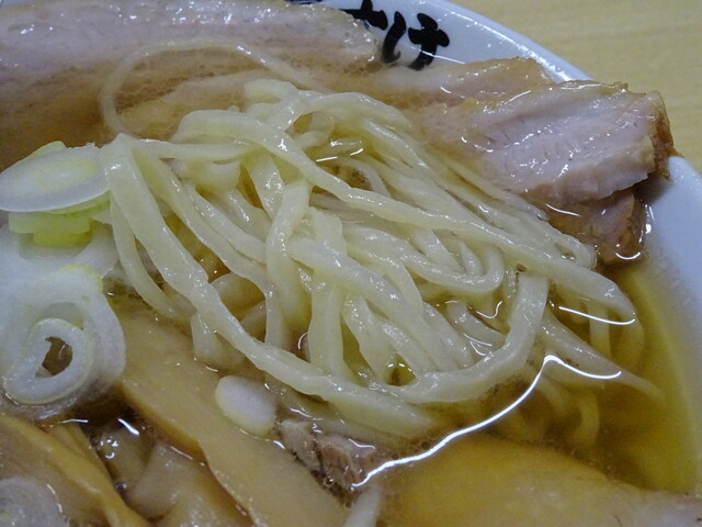 澄んだ綺麗なスープに、軽く縮んだ平打ち麺・厚めのチャーシュー・黄身の色が濃い煮タマゴが入り、
