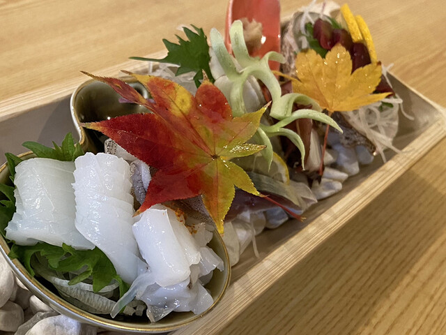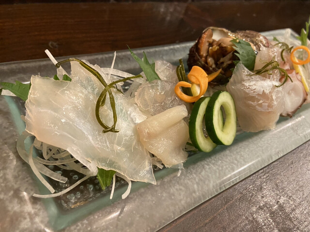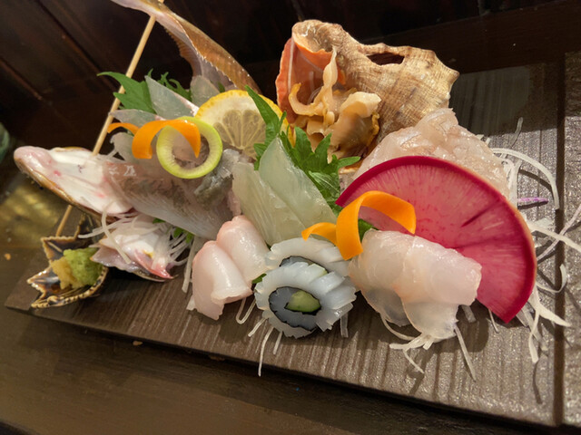 ウマヅラハギの昆布〆、サゴシの炙り、バイガイ、ミシマオコゼ、ムクジ、ヒラメ、タコ、の7種盛りです。