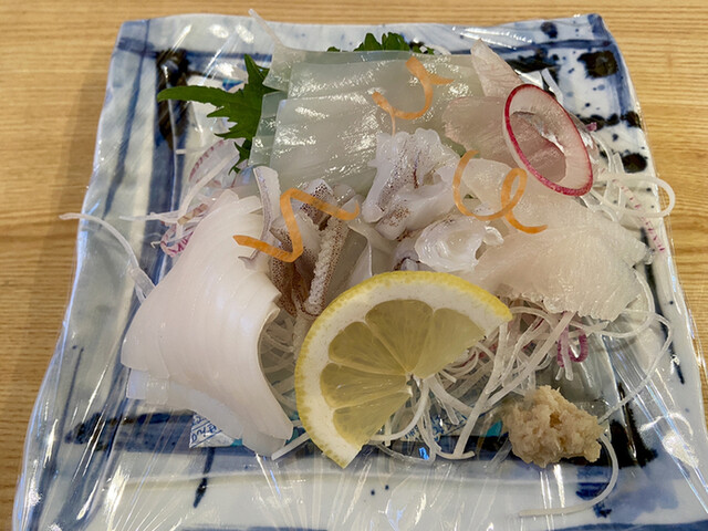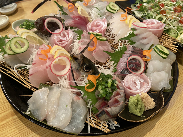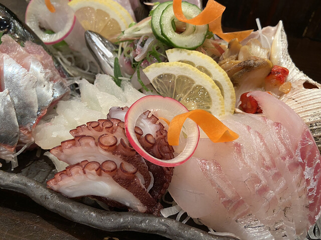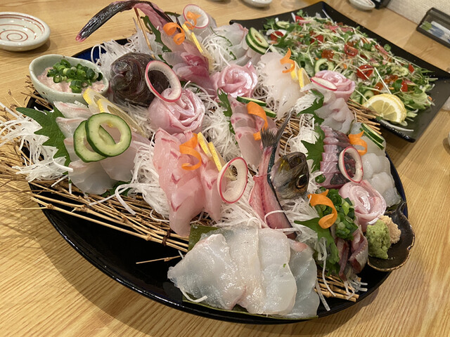 ヒラメ、シマダイ、フクラギ、マダコ、オキアジ、ホウボウ、マルアジ、アオリイカ(ミミ)、が盛られています。